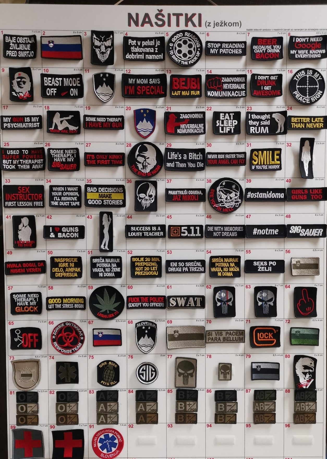 - na samem našitku je pritrjen velcro - trdi del ježka, ki omogoča, da ga namestite na mehki del ježka, ki vam ga tudi lahko priskrbimo mi
